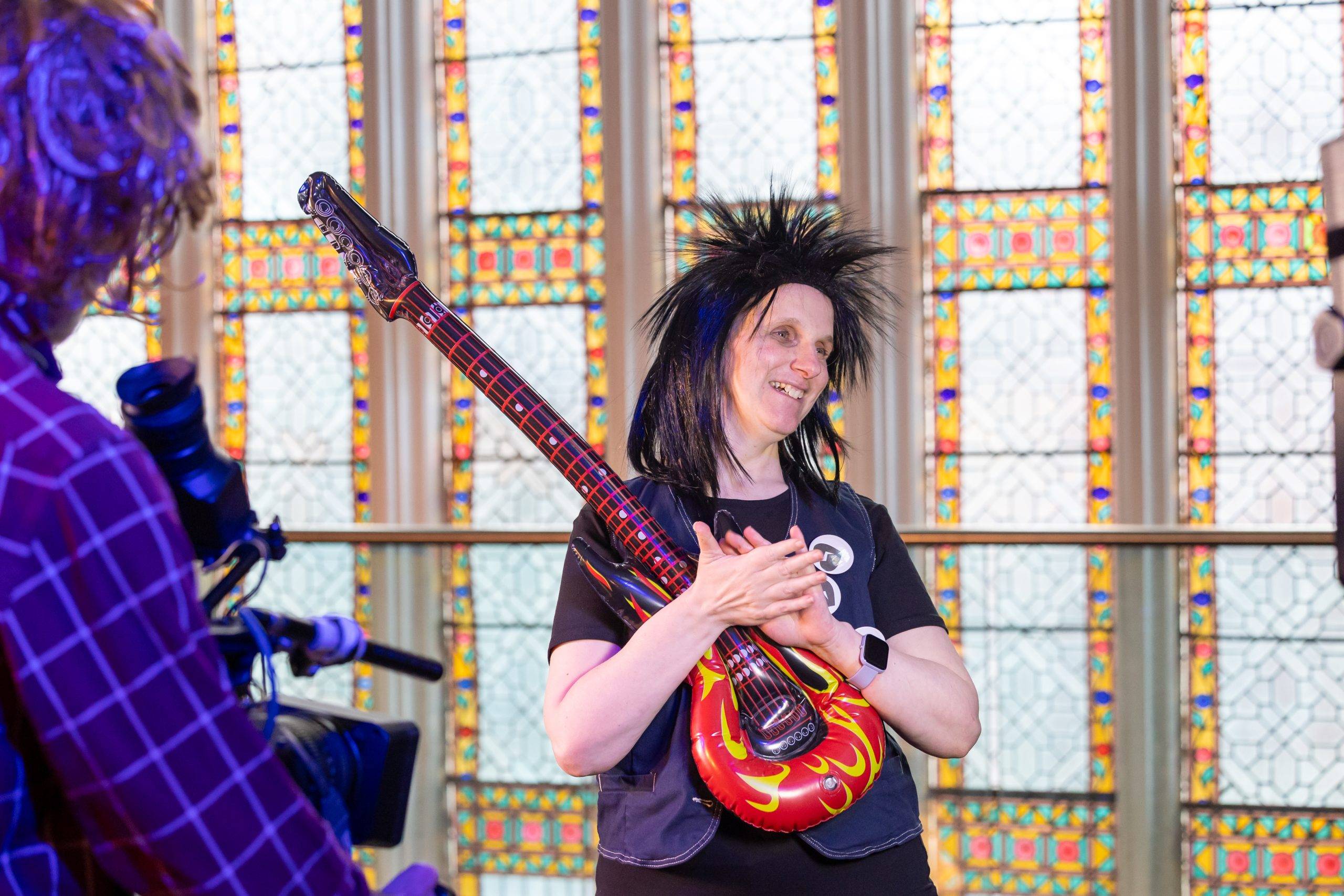 Claire posing with her inflatable guitar at the filming of Missing Kissing